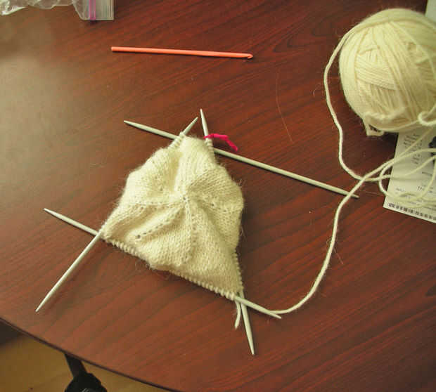(para probar el ajuste, enrosque la aguja con los pies un par de hilos. Deslice sus puntos purl-wise en el hilo hasta el sombrero todo es justo en una cadena de hilo. Esto es flexbile lo suficiente para dejarle probar en, y es fácil conseguir las agujas de nuevo en como eres paciente. Probando el sombrero es esencial)