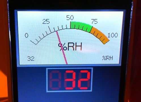 El medidor analógico tiene una aguja móvil que barre lentamente con velocidad configurable para mostrar el nuevo valor de una variable. El valor de este ejemplo es en el rango de 0 a 100 (la usé para mostrar humedad). Meter las etiquetas se pueden cambiar fácilmente. La nueva lectura digital real se muestra en la esquina inferior izquierda del medidor. Topes de aguja son emulados para lecturas fuera del rango normal! Zonas de coloreadas se pueden agregar a mostrar rangos confortables etc..