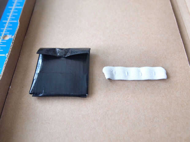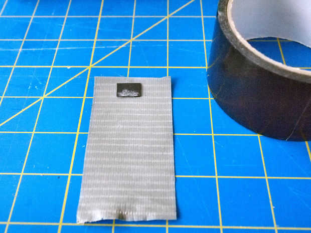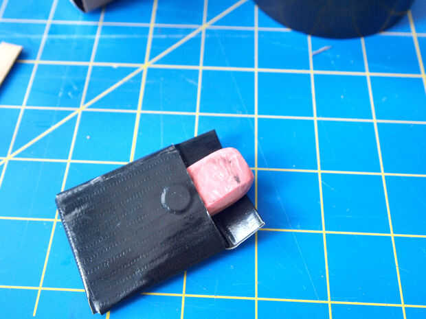 Dobla una pequeña bolsa con cinta adhesiva y añade una arandela de metal y el imán para cerrar la bolsa.  Luego la pegué en la parte interior cubierta al lado de los portalápices.