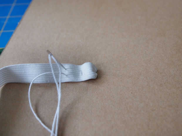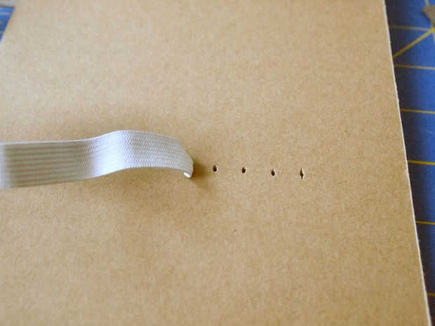 me mide 4-5 orificios, 1 cm de separación en el centro de la cartulina hacia un lado. Me alimentó el elástico a través del agujero final y cosido el elástico por los agujeros formando lazos para sujetar los lápices.  Pegado la espalda con cinta adhesiva para asegurar los extremos.