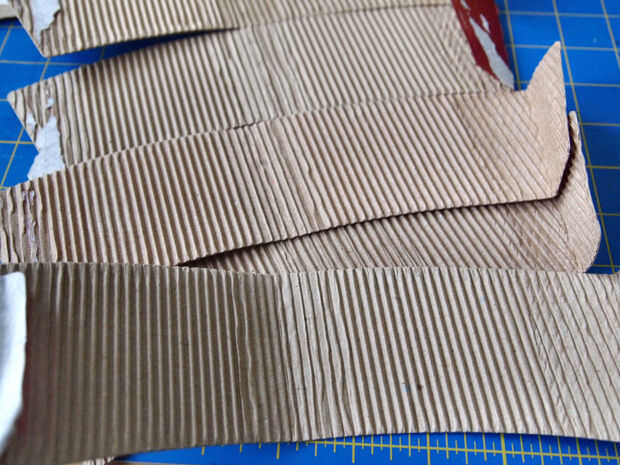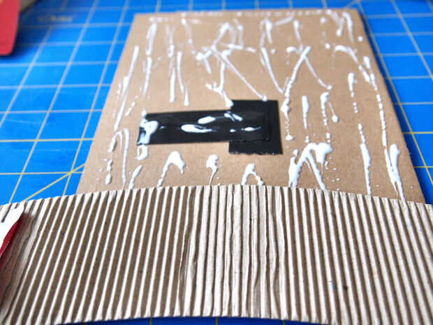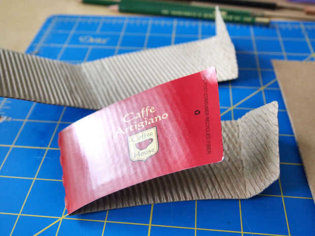 tenía unas mangas de la taza de café cartón mentira alrededor de la cual tenía algunas texturas interesantes.  He decidido utilizarlo como un fondo.  Necesité unos cuatro de estos, les pegué en la parte posterior de la pieza de cartón con el portalápices. Una vez que el pegamento ha secado, cortado las mangas donde sobresale en los bordes.