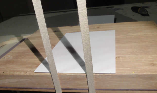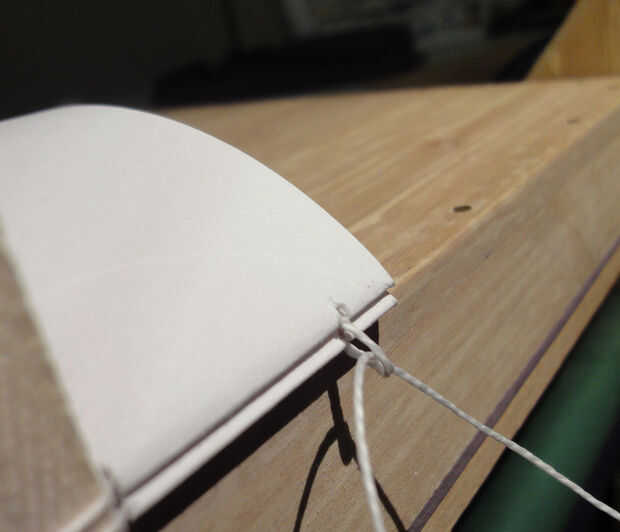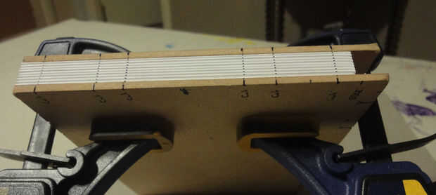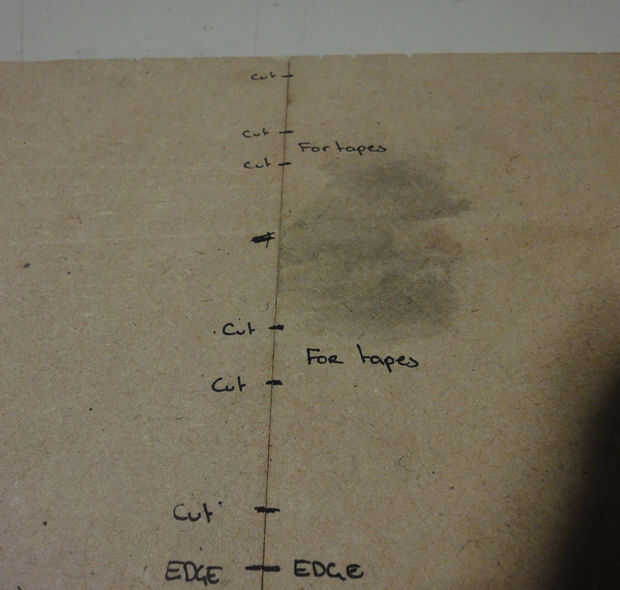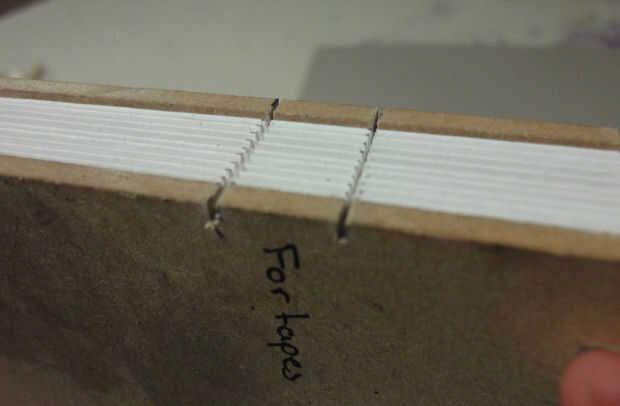 Hacer una plantilla para donde vas a hacer los agujeros en la columna vertebral. Simplemente haz 2 pedazos de la tarjeta de pesado o MDF de 3mm y marque donde se alcanza la parte inferior del libro. Haga una marca de 10mm de ambos extremos (esto es que a partir y terminar la costura de cada firma). Después de la marca donde se coserán las cintas.
