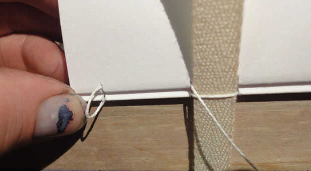 Medir la anchura de la cinta de costura. Hablando de la cinta, se sugiere que utilizar cintas ropa diseñadas específicamente para encuadernación, pero he tenido éxito utilizando cintas y cintas de algodón. En este caso estoy usando cinta de algodón de 12mm.