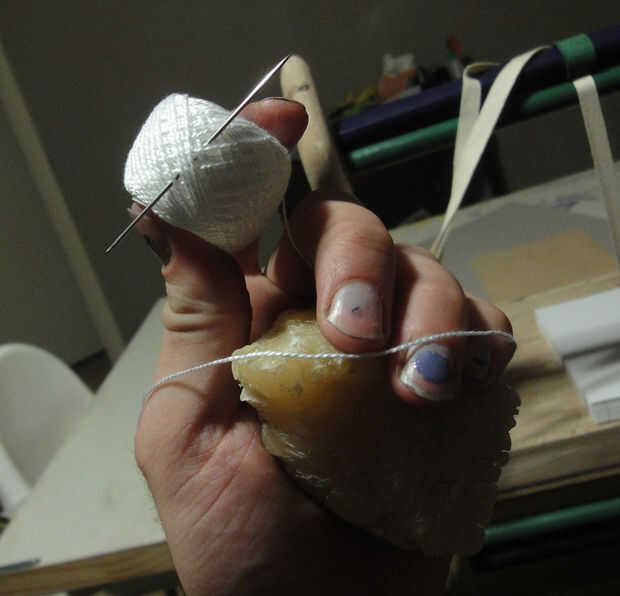 La aguja es importante. Necesitarás algo que es bastante gruesa y larga, pero también tendrá el ojo para estar en línea con el eje. Un montón de agujas de coser más grandes encontrado tienden a haber quemado los ojos. No es adecuado. Usted puede recoger agujas de "encuadernación" en línea o se pueden encontrar en tiendas de trabajo de cuero. Por supuesto cualquier aguja de coser va a hacer en una pizca si usted no puede encontrar nada específico.