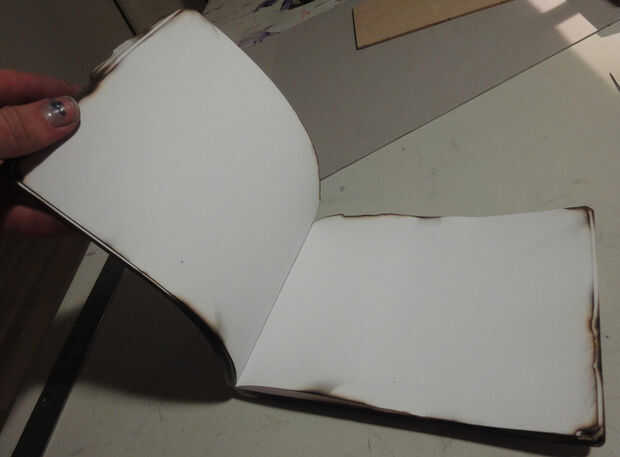 Utilizar el fuego para quemar todos los bordes de su bloque de papel (a excepción de la columna vertebral). Tenga sumo cuidado de no quemarse cos papel coge el fuego muy fácilmente (duh). No quieren quemar demasiado papel lejos, quieres quemar los bordes y redondear las esquinas. Sólo tenía una vela para mí pero un soplete de propano o incluso un poker del hierro caliente rojo sería bueno utilizar. Ser creativo.