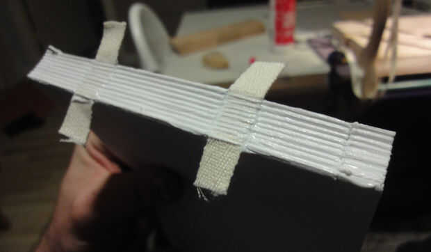 Corta tus hilos gratis marco de la costura y poner una capa de pegamento PVA flexible sobre la columna vertebral. Felicitaciones, ahora tiene un bloque de papel. En este punto sería recortar el borde de delante de su bloque de papel para sobrehilar el efecto irregular tiene. Puede utilizar un cuchillo, una guillotina diseñada para lotes de papel o incluso un cincel modificado.