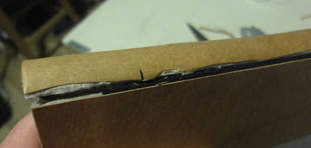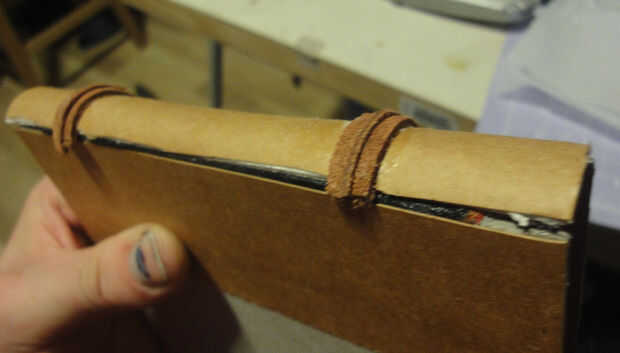 Marca en 30mm en ambos lados de la columna y pegar algun pegamento sobre la línea. Corte varias longitudes de cuerda, cuero, cordones de los zapatos, cartón, etc. para mentir sobre la columna vertebral.