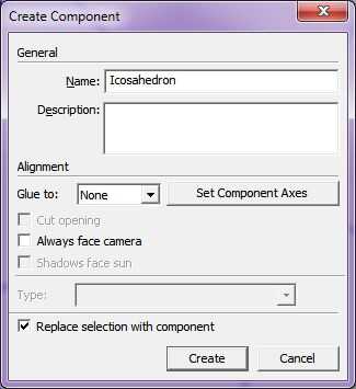 Una vez que todos los lados están orientados correctamente, haga doble clic en un lado para seleccionar todo. Haga clic derecho y seleccionar Crear componente. Esta vez se tomó el tiempo para nombrar el componente como el icosaedro y hecho reemplazar selección con componente fue marcada. A continuación, haga clic en crear.