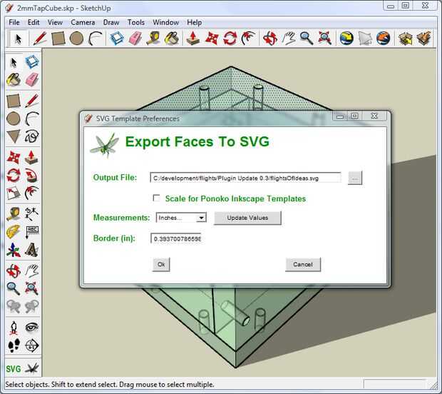 He desarrollado este plugin de SketchUp para el diseñador entusiasta (alguien que no puede justificar el software caro para una afición). Le permitirá utilizar el paquete de diseño 3D SketchUp (disponible gratis), junto con un editor de gráficos vectoriales escalables (SVG) como Inkscape (fuente abierta), para crear formas 2D para láser de corte o fresado.