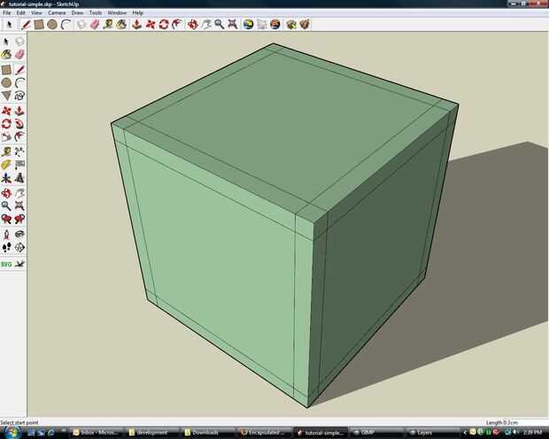 Siéntase como un cubo en SketchUp y decidir sobre el espesor del material. La primera imagen muestra un 4cmx4cm base. A partir de ahí saca un cubo 4x4x4cm (cuadro 2).