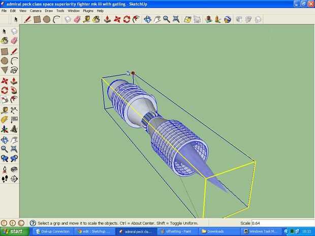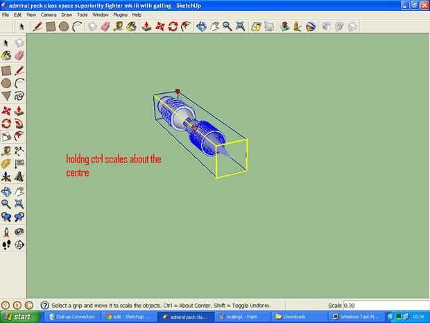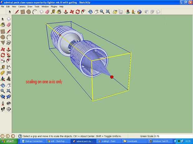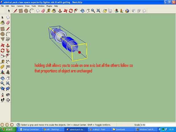 a veces una parte es demasiado grande o pequeña en comparación con el resto del modelo, que es donde la herramienta de escala viene pulg seleccionando un objeto y luego haga clic en la herramienta de escala trae para arriba una caja alrededor del objeto, puede hacer clic y arrastrar en las cajas de esquina, borde o la cara amarillas a estirar o encoger el objeto. "ctrl" le permitirá a escala sobre el centro del objeto en lugar de lo opuesto, "cambio" escalará el objeto por la misma cantidad en todos los ejes sin tener en cuenta que la caja se mueve, esto puede ser útil para cambiar el tamaño de un objeto para que sobre un eje sus extremos coinciden con las posiciones de otras geometrías pero el objeto no se modifica en proporción.