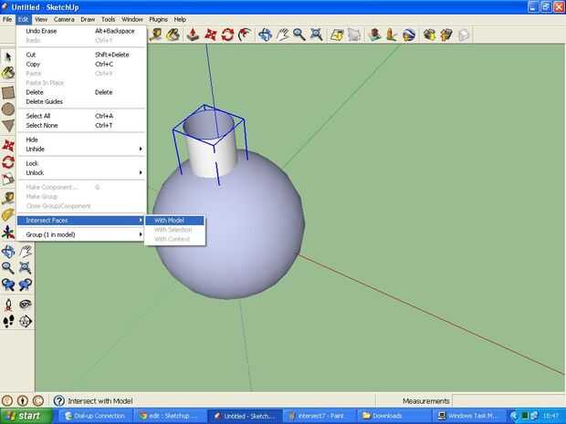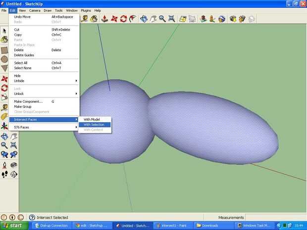 se cruzan es útil donde hay superposición de formas complejas pero quiere convertirlos en una cáscara externa. también puede ayudar con los agujeros del corte en una superficie curva. el proceso es sencillo, sólo tienes que seleccionar los objetos/rostros desea intersectar y luego ir a "Editar--> intersectar caras--> intersectar con contexto de selección de modelo". intersección con el modelo se significa que una línea es creada a través de todas las caras que el objeto seleccionado con, intersección con selección de líneas sólo agregan seleccionados objetos se cruzan cada uno otro y que se intersectan con el contexto significa que un objeto sólo se cruza con cosas dentro de su grupo/componente y no fuera de ese grupo. después de diversas caras pueden borrarse para dar varias formas nuevas. Si el objeto seleccionado es un grupo o componente entonces las líneas creadas estará fuera por lo que sus caras no se reducirá.