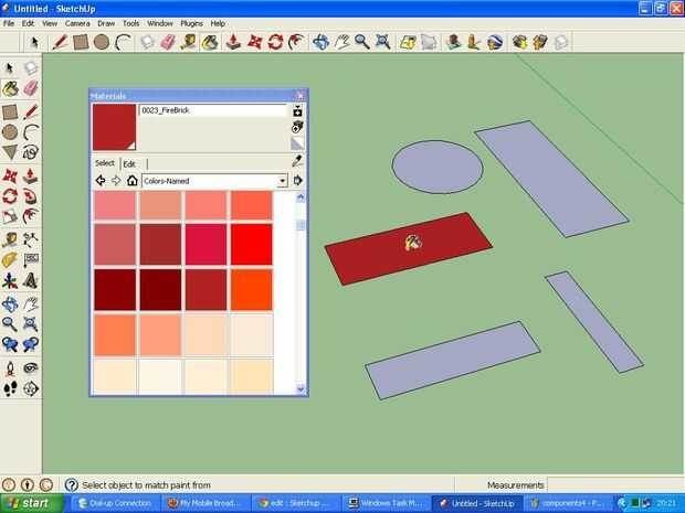 hay una herramienta de la pintura de la muestra (icono de cuentagotas) que le permite hacer clic en cualquier superficie en el modelo y selecciona el material aplicado, haga clic en otra cara luego se aplica el mismo material a ella. hay una ficha para hacer un nuevo material que le permite (sorpresa, sorpresa) crear un nuevo material y establecer todas las propiedades (incluyendo una textura) pues en mucho la misma manera como puede modificar propiedades de los materiales existentes. por último debo mencionar que cuando quiere modificar un material un poco pero deja el material original en otra parte en el modelo puede ser útil cambiar el nombre de un material en la barra en la parte superior de la ventana, también es importante cuando la importación de piezas de otros modelos con el mismo nombre material pero diferente color/textura del material en el modelo ya con ese nombre. para pintar caras múltiples del mismo color a la vez todos ellos Seleccione a uno de ellos con la herramienta de pintura como le pinta una cara individual y tendrán el mismo material colocado en ellos.