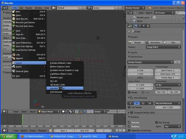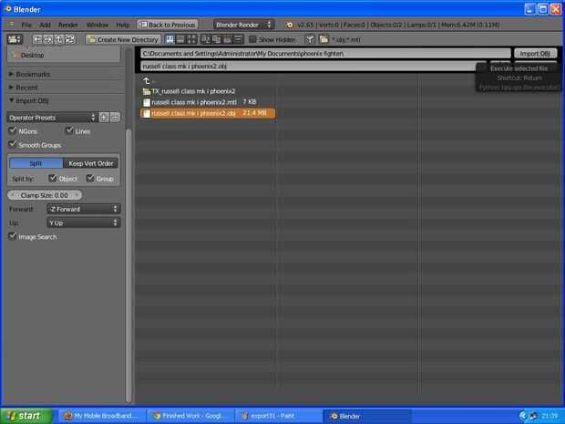 23. importar el nuevo obj archivo usando "archivo--> Importar--> wavefront(obj)", luego busca el modelo. dejar las opciones de importación de la configuración predeterminada. Estos son los siguientes