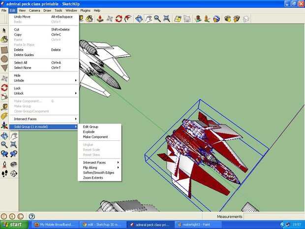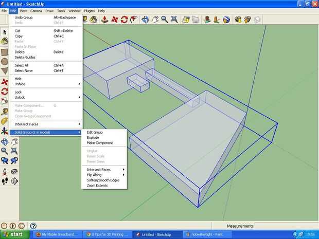 como nota final debo decir que la mejor opción para hacer un modelo imprimible es modelar en sketchup primero guarde el modelo como un grupo y crear otro grupo compartiendo las mismas superficies exteriores como el modelo original. Este grupo debe ser etiquetado como un grupo sólido cuando se selecciona en exterior, si es que sabes que el grupo es imprimible. todas las partes blancas que caras deben apuntar hacia afuera en el grupo que desea imprimir.