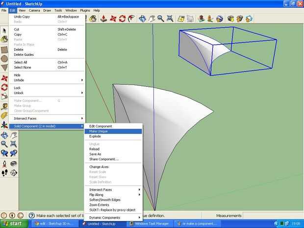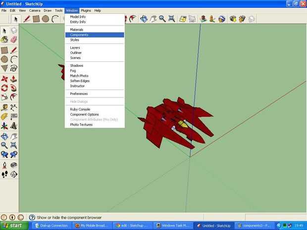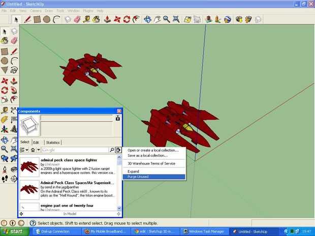 También hay una pestaña llamada la ventana de componentes haciendo va a "ventana -> componentes". Esto puede usarse para buscar 3d warehouse para componentes para agregar al modelo, o para modificar algunas propiedades básicas de los componentes. pero el más importante uso es hacer clic en el icono de inicio para ver qué componentes están en el modelo y luego ir a "(right arrow symbol)--> purga no utilizado". Esto elimina los componentes forma el modelo y reduce el tamaño del archivo. muy útil cuando usted ha terminado un modelo y desea subir a la Galería 3d.