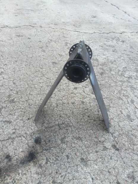 Después de haber soldado la parte superior tienes que voltearlo boca abajo y apoyar con algo. Entonces tienes que tomar un eje de bicicleta con la barra y los rodamientos y soldar en el interior del triángulo. Para obtener este concentrador de bicicleta cortó todos los radios en una rueda de bicicleta y retirar el cubo del centro. Después de haber soldado la parte superior del triángulo y eje en el interior, usted está listo para montar tu triángulo a otra franja de acero. Coloqué el triángulo sobre el acero y marcados dos pulgadas a cada lado del triángulo marcó y luego cortarlo. Usas esas dos pulgadas para montar a una estación de esquí más adelante. Después de haber cortado su línea de acero el triángulo respaldo y soldarlo colocar.
