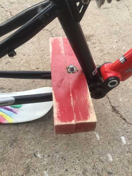 Añadir pie de clavijas a la bicicleta utiliza chatarra 1 por 1s atornilladas. Hice mi largo 11 1/2 pulgadas pero se puede hacer menos o más dependiendo de su preferencia. Para fijarlos a la bicicleta que utiliza un perno de 1/2 pulgada y tuerca perforado a través del orificio de stand de tiro.