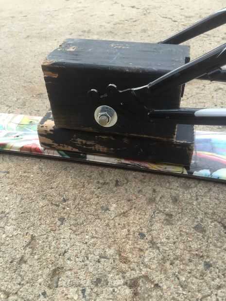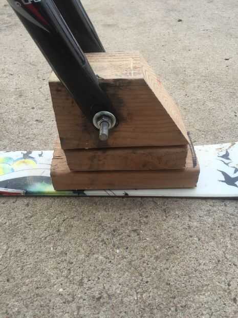 También puedes hacer esta moto con madera en vez del metal si no tienes un soldador. Para hacer con la madera tienes que empezar con un bloque de 4by4 alrededor de 4 a 6 pulgadas de largo. Usted puede hacer lo mismo con 2 por 4s atornilladas si no tienes una 4 por 4. A continuación tienes que perforar un orificio de 3/8 derecha por en medio de su bloque de madera. El eje pasará por esto. Siguiente tornillo en un dos por cuatro a su bloque y seguir añadiendo bloques hasta llegar a su altura. Utilicé 2 añadido bloques en la parte delantera y uno había añadido bloque en la parte posterior. Después de tener su altura agregar los esquís. Para ello utilicé tres tornillos de tres pulgadas para countersinked en la parte inferior de la estación de esquí. Después de hacer esto estás listo para montar a la bicicleta. El frente no girará a menos que te afeitas abajo del bloque por lo que sólo puede añadir una arandela y una tuerca para fijar en la bicicleta. La parte posterior girará para poder utilizar al combo arandela tuerca arandela tuerca que se utilizaron para el montaje del metal.