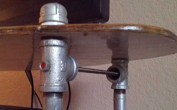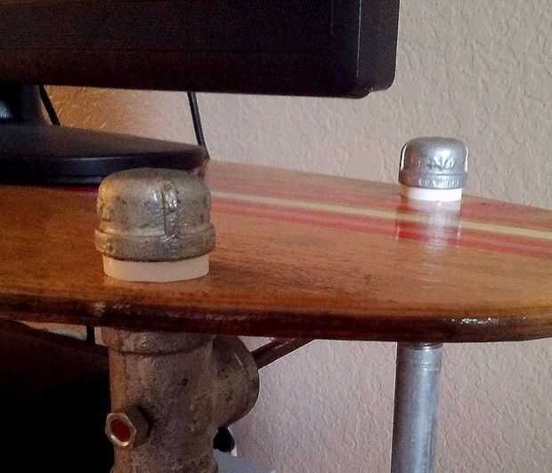 A continuación había roscado un niple de 1-1/2" en la parte superior de la T más superior y se deslizó el skimboard pasado sobre ésos. Tenía tapas para poner en los extremos de los pezones para acabar con ellos fuera, pero el pezón era demasiado largo para presionar contra la parte superior de la Junta de la descremada, así que me pareció flojo. Para solucionar ese problema, me rebusqué en mi garaje y encontró una PVC tubería sólo lo suficientemente grande como para deslice sobre el tubo galvanizado. Así que corte retuerce de eso unos 3/4" de ancho, se deslizó ésos sobre el pezón y luego ponga la tapa en. La tapa hacia abajo sobre el PVC, que empuja hacia abajo en el skimboard y había reforzado todo. Es agradable.