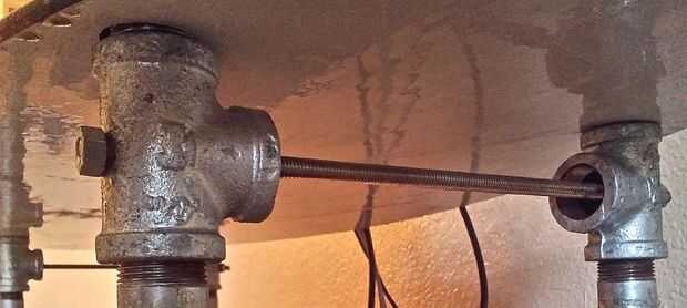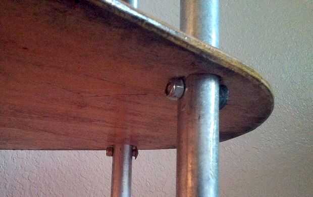 Entonces pasó la varilla de 1/4 "x 20 roscada a través de los agujeros en cada una de las T por debajo de la parte superior más estante de skimboard. Tuve que menear el T alrededor un poco para conseguir todo a derecho. Las varillas roscadas eran más largas que lo necesario, así que marcó uno de los extremos y cortar con una sierra para metales. Luego desliza la varilla a través de los agujeros en el T otra vez y atornillar una tuerca de seguridad 1/4 en cada extremo. Reforzado estos para traer las columnas modo estaban presionando contra el skimboard, dando todo el asunto un poco más de soporte estructural.