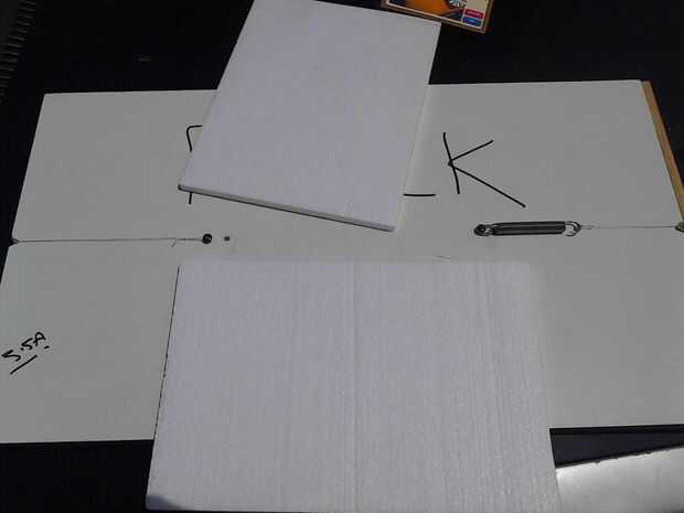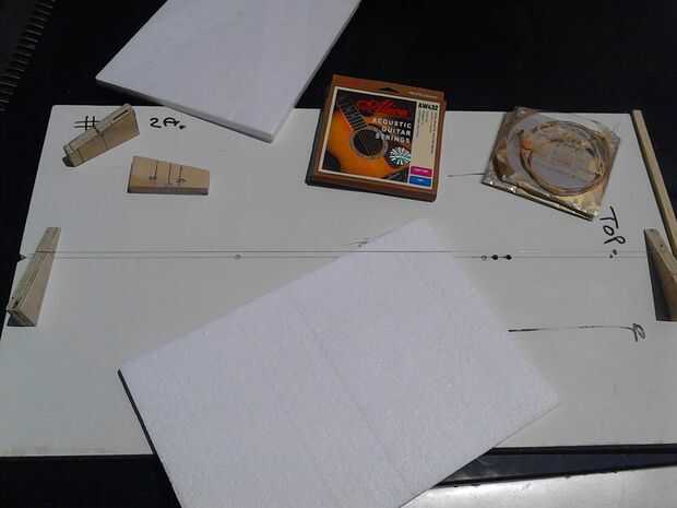 Muy simple este uno, agarrar una tabla plana (el mío es malamine para slipperyness), una cuerda de guitarra, par de tornillos, un resorte y algunos pedacitos cónicos de madera.