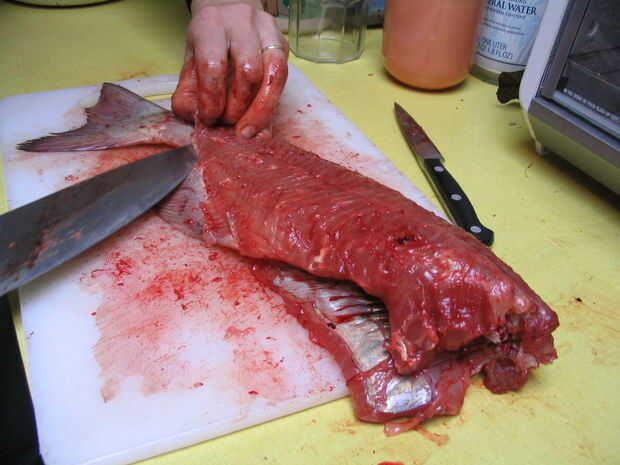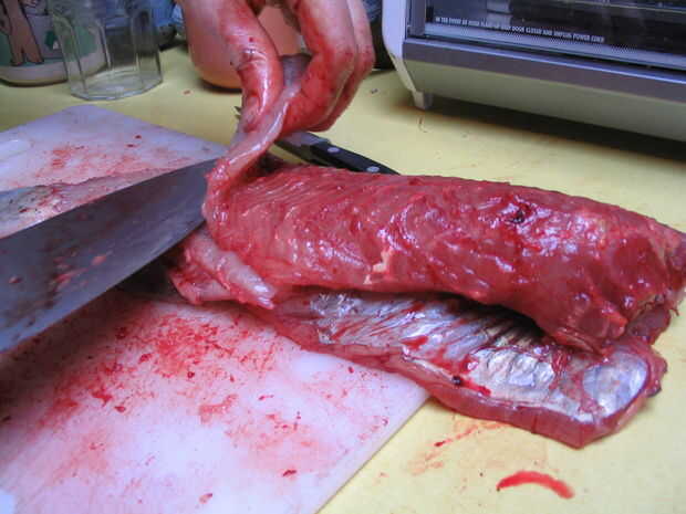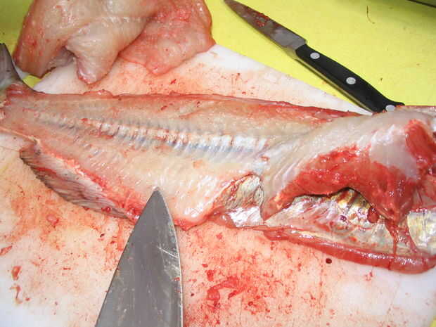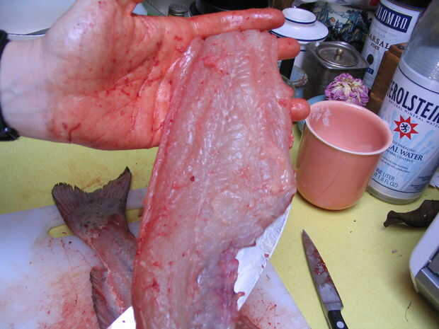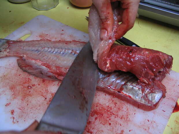 Al llegar a las costillas necesitará recortar con cuidado para evitar dejar las costillas en su lomo. Reflexionar: ¿Qué vas a hacer con este pedazo de pescado? Si vas a cortar en revolver-fríe pepitas está muy bien para ser más rápido y un poco desordenado en el área de la costilla, mientras que si vas a utilizar todo el filete debe tener más cuidado mantenerlos intactos. Esto se hace más fácilmente trabajo de la columna vertebral, filtrado a lo largo de las costillas para quitar tanta carne como sea posible.