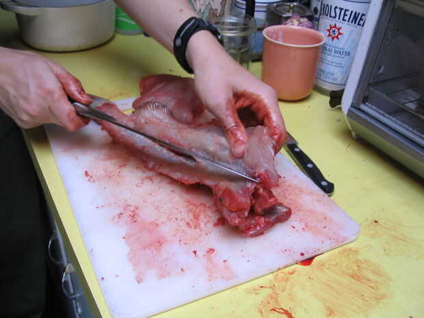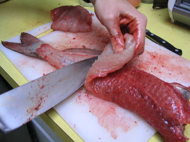 Voltee el pescado y repita el proceso en el otro lado. Tiene la misma técnica, aunque puede ser más difícil mantener el pescado y nivelado cerca de los huesos con el otro lado de los peces ya retirados. Por supuesto, esto hace que la espina dorsal más flexible; en general, un lavado. Que es una oportunidad para perfeccionar su técnica y hacer un filete más ordenado de lo producido a partir de la primera cara.
