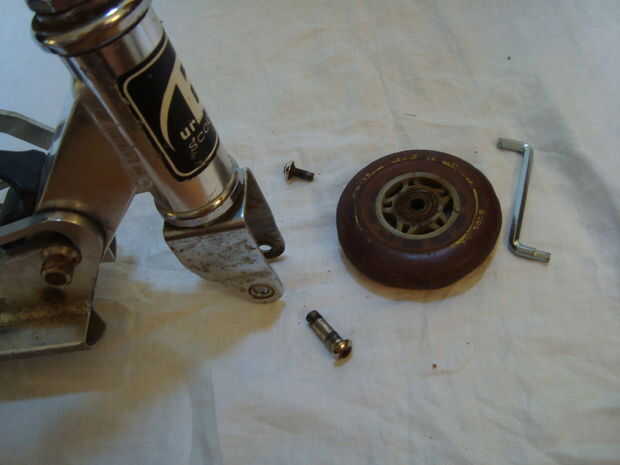 Para empezar a su skoot n ' esquí tendrás que quitar las ruedas de tu moto. Para ello utilice una llave allen y aflojar los tornillos, asegúrese de no perder ninguna de las piezas, luego quitar las ruedas.