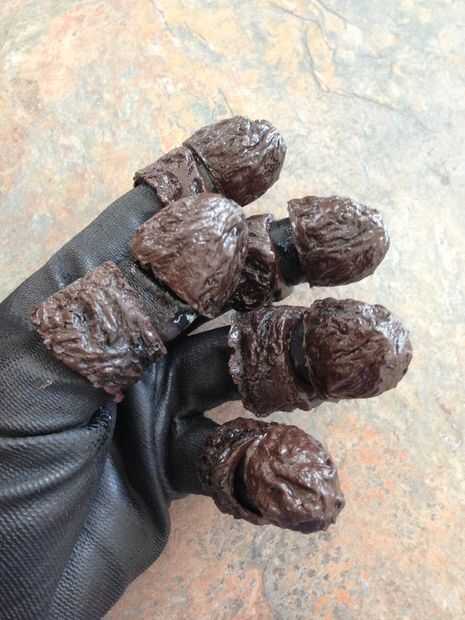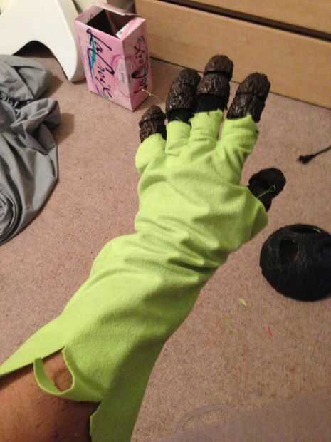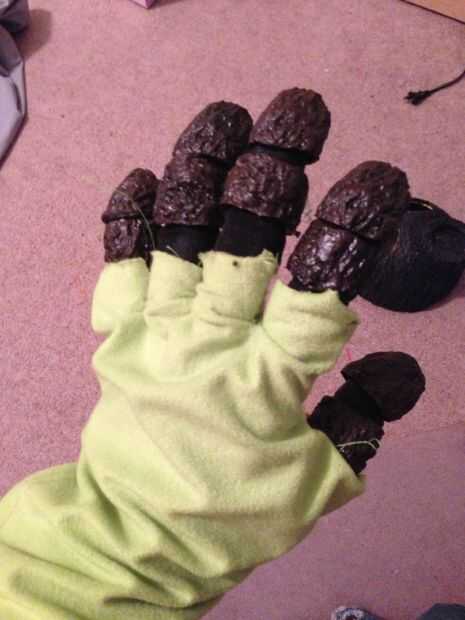 Las manos eran probablemente la parte más difícil del traje porque quería tener articulación completa manteniendo la realizo de mirada de madera. Logra esculpir cada pieza para una mano echando entonces múltiplos. Después de algunos dremeling y limpieza pegado a un barato guante que i les cosen sobre el guante del traje real.