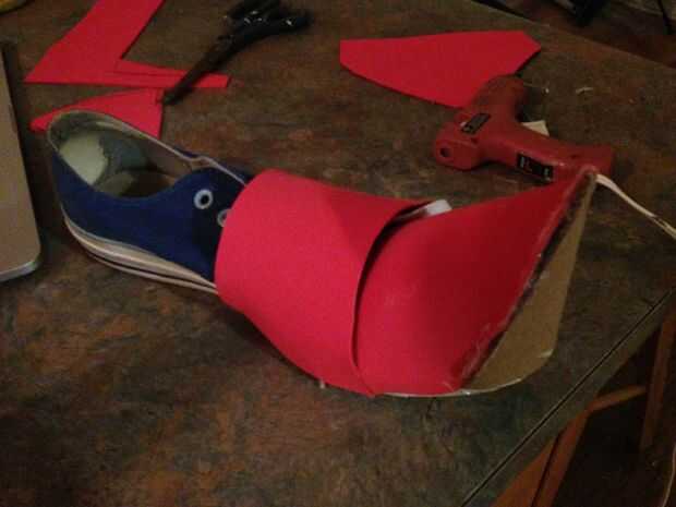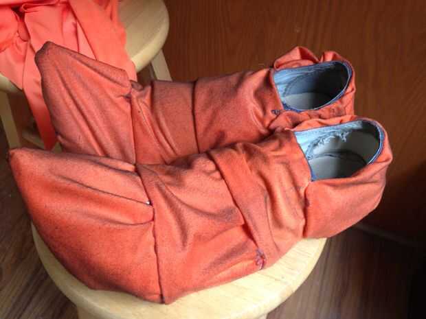 Los zapatos como el sombrero eran simple cobertura del faux. Tomé un viejo par de converse y, usando espuma de artesanía, había hecha la forma deseada de la zapatilla. Que i cubierto en la misma tela del traje. Con la adición de los anillos y algunos piel artificial los zapatos eran cómodos y parecía bueno.