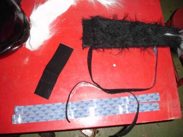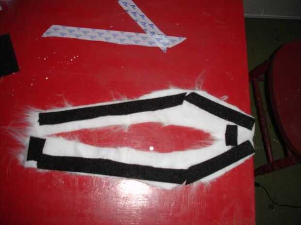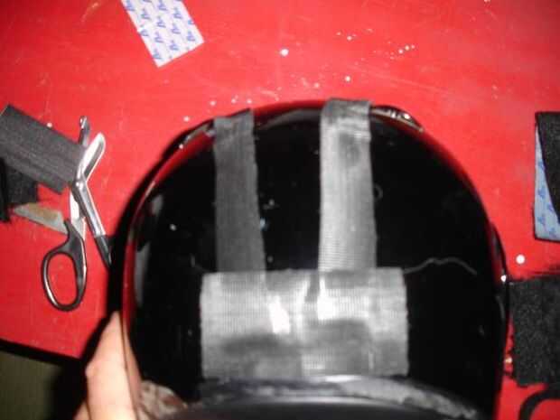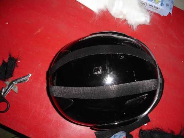 Corte tiras de Velcro lo suficiente para alcanzar completamente sobre el casco. Usé 2" cosas, así que tuve que cortar longitudinalmente. Respetar el lado del gancho para el casco, a lo largo de donde va a ser la banda. ' S más fácil pegar el Velcro correctamente si se quita el protector. Puse el lado del gancho en el casco, así si pierdes lo borroso en la raya, el Velcro se pegue a la raya de sí mismo. Poner una tira más ancha transversalmente en la parte posterior donde se atará la cola. Poner una tira de fuzzy en el extremo de la muesca de la cola y las tiras en las rayas. Pegar em!