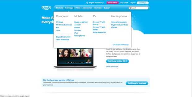 Paso 2: una vez en el sitio web de Skype, arrastra con el ratón al lugar que dice obtener Skype. Una vez que el mouse está allí, un menú va a pop up. En este menú vamos a elegir si queremos descargar el Skype para un software de Mac o un Windows. Haga clic en el software que queremos Skype para descargar (mac o windows).