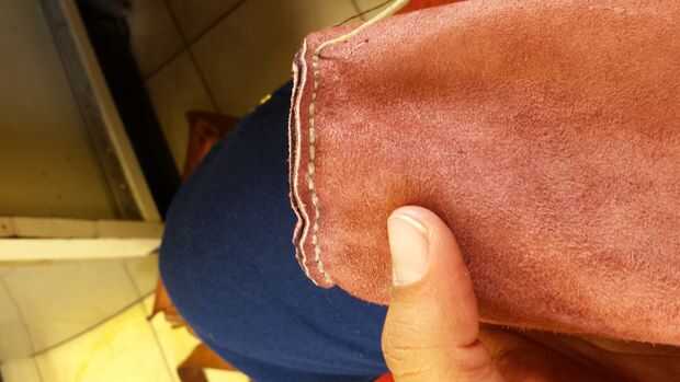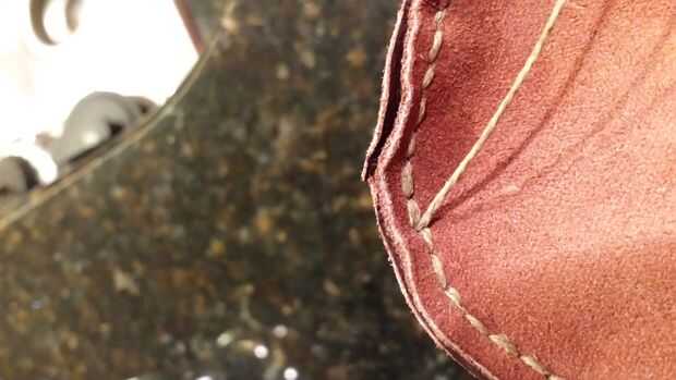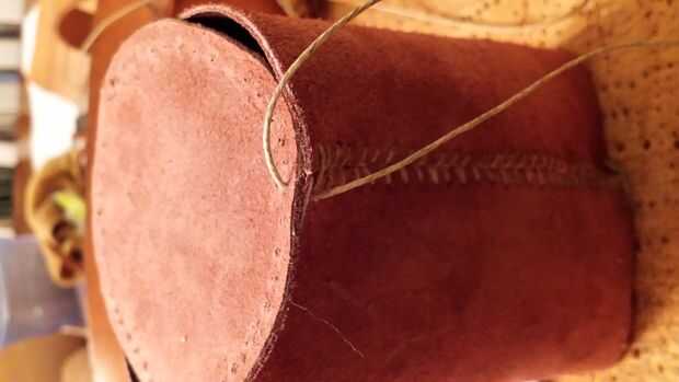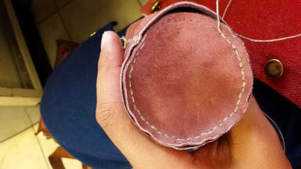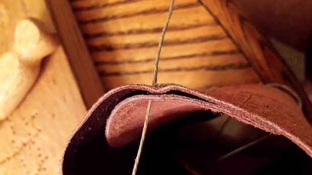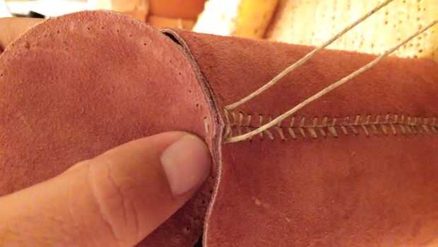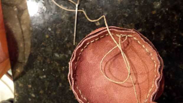 Antes de adentrarnos en lo que es esta puntada, flip su creación adentro hacia fuera, de esta manera la costura se crea en el interior y oculto de la vista. Otra vez, coge el hilo de rosca (Asegúrese de que está encerado), dos agujas y mantenga su punzón cerrar a mano.