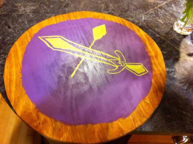 Este escudo es del videojuego Skyrim. Cada uno de los nueve bodegas, ciudades, tiene este escudo con un símbolo único. Te llevo a través de mi proceso de creación de dos escudos. Uno aproximado como juego tamaño exacto en 24" con el símbolo de Dawnst