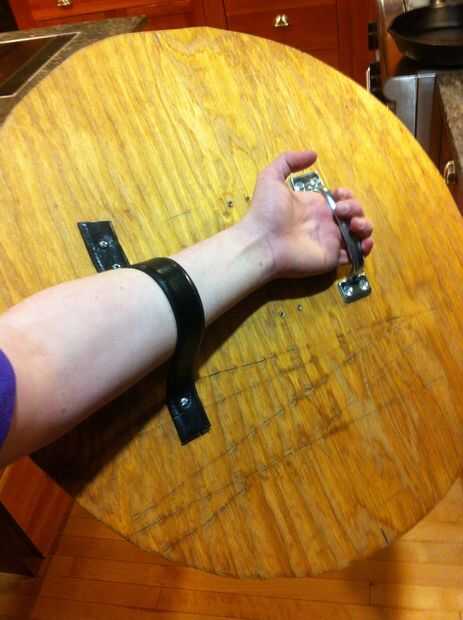 El mango es una manija del gabinete regular. No seas como yo y haz uno demasiado pequeño. Usted quiere ser capaz de doblar su muñón por debajo de ella.