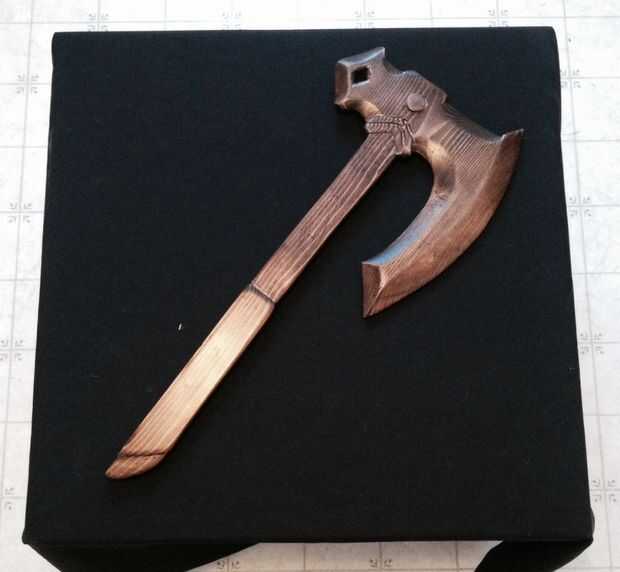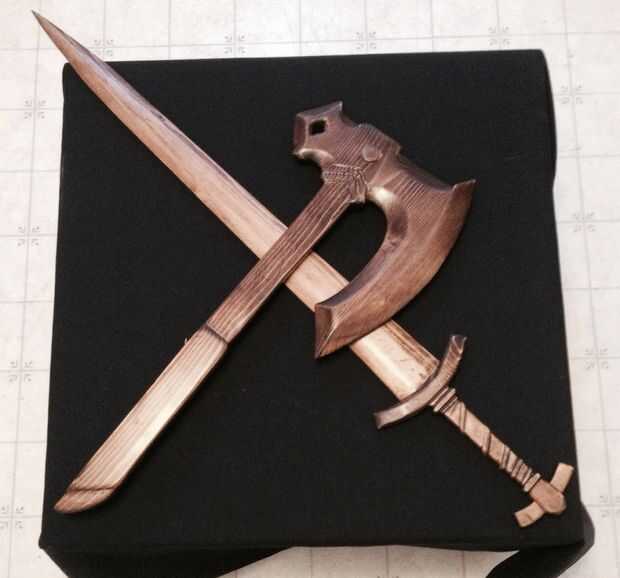 Skyrims guerra hacha y hierro espada de hierro recreada en madera. A escala... Más o menos. Sólo cuesta alrededor de $10 para un pedazo de knotty estante de pino, una lata pequeña de tintura de nogal y pueden de capa clara de varethane.