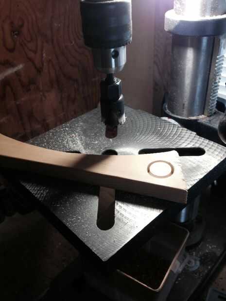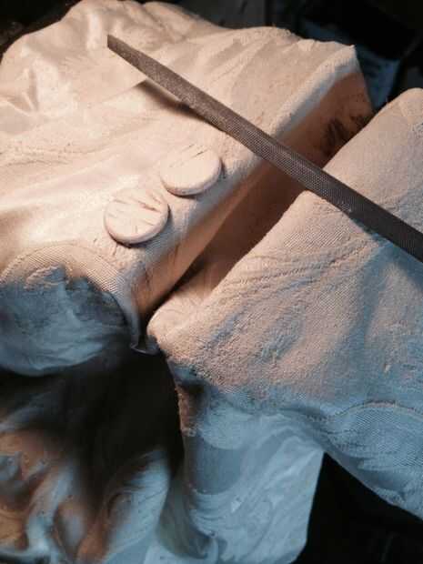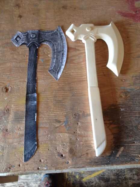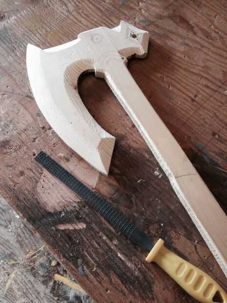 Para hacer los dos remaches pequeños círculos sobre la guerra hacha utilicé un agujero vio con el pedacito de taladro de centro quitado. Cortar por la mitad con una sierra de cinta y luego lijar a mano. Une con pegamento.