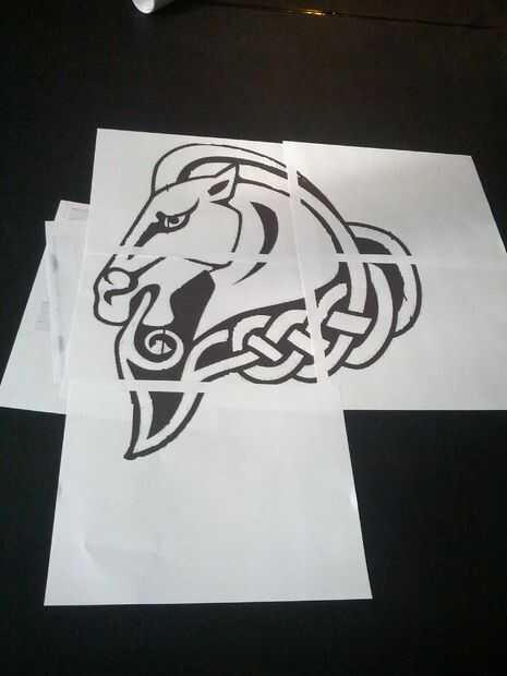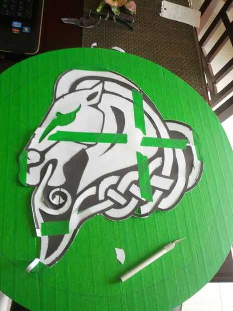 Recortar la plantilla, coloque en tu escudo y colocarlo en el centro de su círculo, asegurándose de que ninguna parte está fuera de la pintura amarilla. Volver a aplicar cinta de pintor, luego la cinta la plantilla sobre la parte superior.