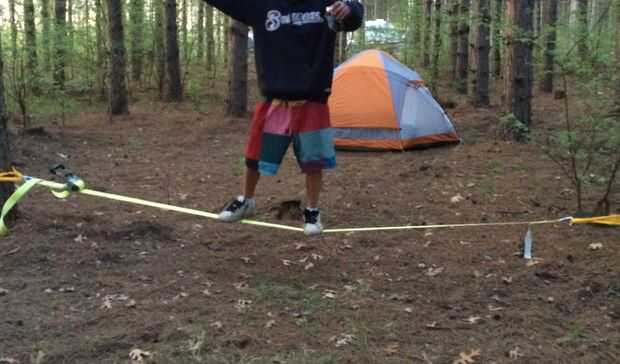 Slacklining es una actividad emergente que utiliza el equilibrio y la habilidad para caminar en una línea suspendida entre dos puntos fijos. Se puede hacer en un patio, en un campus universitario, un cañón, y hasta miles de pies sobre la tierra. Much