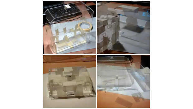 Una vez que tengo mi corte de plexiglás continué con ensamblar todas las piezas juntas. Como ya tenía un dibujo en 3D es mucho más fácil para poder unir las piezas. He utilizado alguna cinta de papel para sostener las piezas en su lugar mientras estaba pegando.