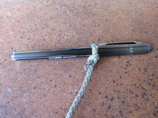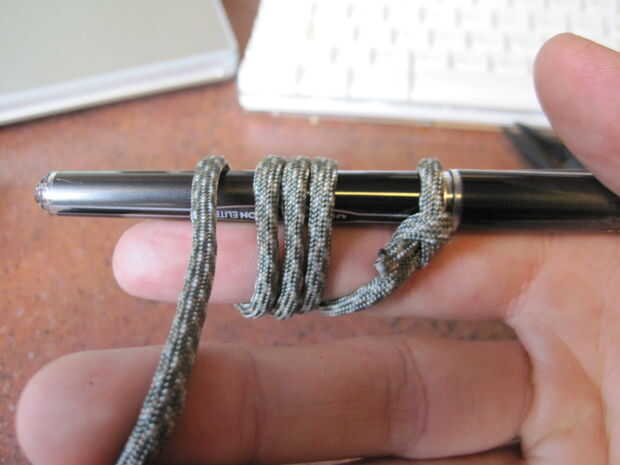 Un nudo de deslizamiento medio enganche primero deslícelo sobre la pluma o lo que usas. Luego comenzar a enrollar el cable detrás de la pluma y en la parte superior. Lo envolvió alrededor cuatro veces pero puede sin embargo muchos usted desee dependiendo de lo ancho que desee. Saque su dedo y deje un espacio en la pluma.