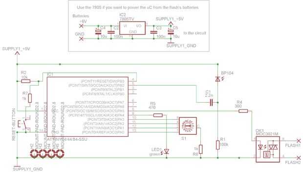 Si usted proporciona una tensión de 5V y por debajo de una batería entonces puede omitir la parte con el regulador de tensión 7805 y directamente de la fuente del microcontrolador. Todo el circuito utiliza 2mA en reposo, por lo que sería una celda de moneda pequeña vacía muy rápido, que se por qué elegí el flash y el controlador de la misma fuente, lo que es menos complejo.