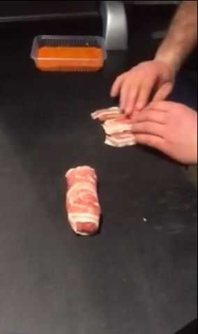 el fatback alrededor de la carne del rodillo, asegúrese de que se enrolla firmemente.