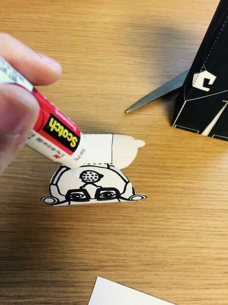 9. Agregue el pegamento a las solapas en la parte superior del casco espacial y unir.