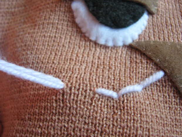 Luego cosido alrededor de los ojos con lana blanca para crear ese aspecto de búho de la firma.