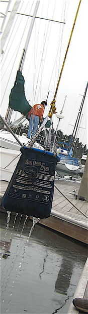 El otro método que nos gusta es el SlickSack desde el bauprés, y dar la vuelta con un balde recogiendo agua y vertido en el saco. No todo el mundo tiene un bauprés, así que necesitas encontrar algo más que colgar de, o sólo puede arrastrarlo. Obras de arrastre, pero colgante es más rápido.