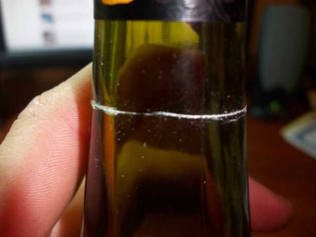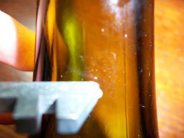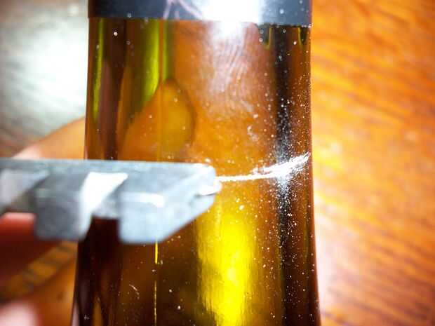 Para utilizar el cortador de cristal marcar una línea alrededor del cuello aplicando presión con el disco de corte a lo largo de la Copa, como en la foto. Tratar de hacer uno solo, línea recta para conseguir un corte bueno y limpio.