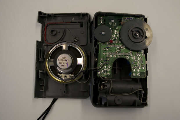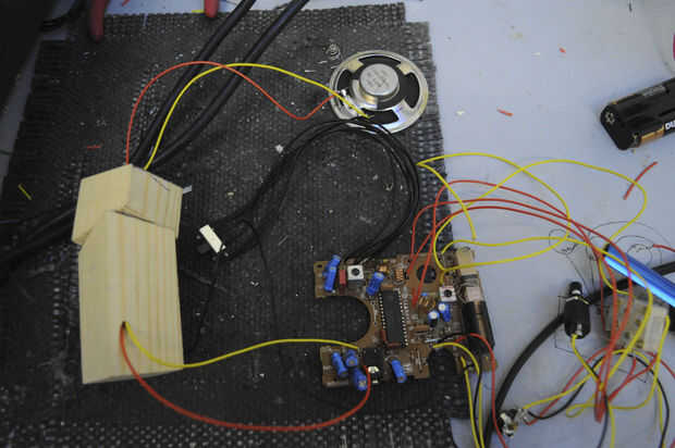v) nuevo cable del altavoz a través de la pieza de madera giratorio.
