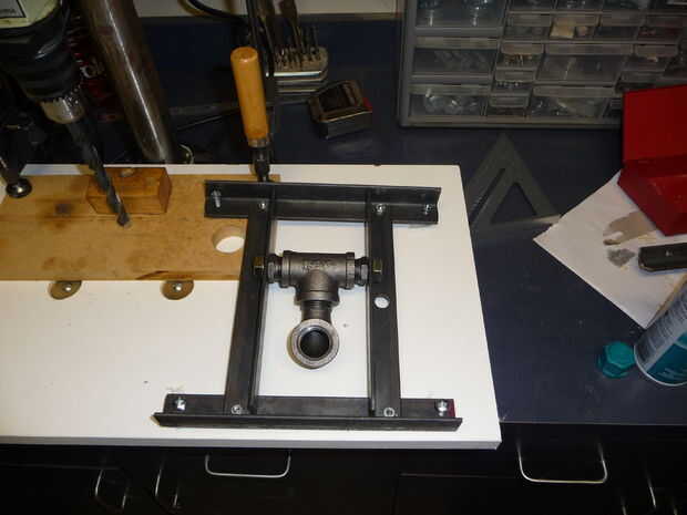 Lo primero que hice fue hacer el marco que le fijan a la parte posterior de la TV. Una vez más, los agujeros de mi TV son 200x200mm, así que hice el marco solo un toque sobre esto que me diera algún juego, a aprox. 220mm. Corté las piezas vertical para ser derecho a 200mm pensando que podía moverlos hacia arriba y hacia abajo según sea necesario, resultó que con el espesor del material y las posiciones de los orificios, no necesito moverlos a todos. Marqué mi agujeros en el ángulo horizontal 200mm aparte (tuve que comprar realmente una regla métrica para esto). Entonces junté el T caber con los bujes para determinar la distancia entre los soportes verticales. Sujeta los T-fittings para las verticales y luego hizo que la distancia entre los agujeros horizontales fue 200mm también, entonces sujeta las piezas verticales en su lugar y taladrar los agujeros para los tornillos de 1/4".